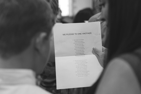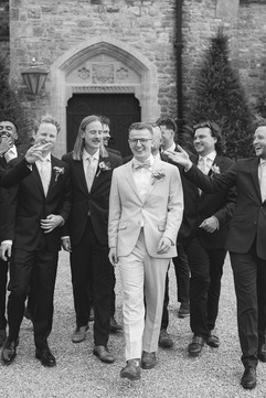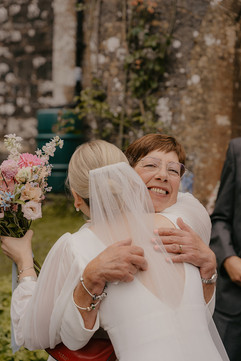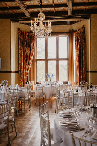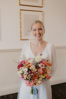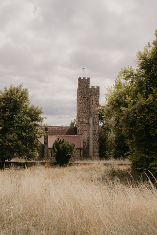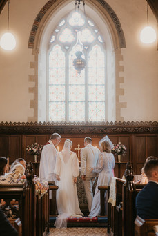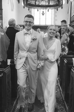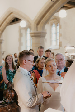 The couple chose to exchange vows in the estate’s beautiful church, a historic gem nestled within the grounds of Huntsham Court. The soft light filtering through stained glass windows created a gentle glow. I loved the bride's dress with floaty sleeves and a delicate, long veil that gently caught the breeze now and again. Her elegant style was complemented by bridesmaids in striking blue patterned dresses, which added a fresh pop of colour against the warm tones of the church interior.