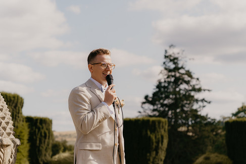 After the ceremony, the celebrations moved outdoors to the estate’s lush formal gardens. The speeches took place in this open, airy space, where guests enjoyed drinks and light-hearted garden games. This part of the day was full of candid moments, from laughter to heartfelt toasts, all captured naturally without interruption.